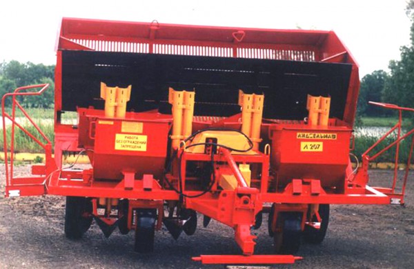 Картофелесажалка полунавесная четырехрядная Л-207 предназначена для рядковой посадки непророщенных клубней картофеля на почвах всех типов с междурядьями 70, 75 и 90 см. Сажалка агрегатируется с тракторами типов класса 1,4 т.сю (МТЗ 80/82, МТЗ 100/102). Загрузка картофелесажалки картофелем производится из любых самосвальных транспортных средств. Картофелесажалка оборудована туковысевающим аппаратом.